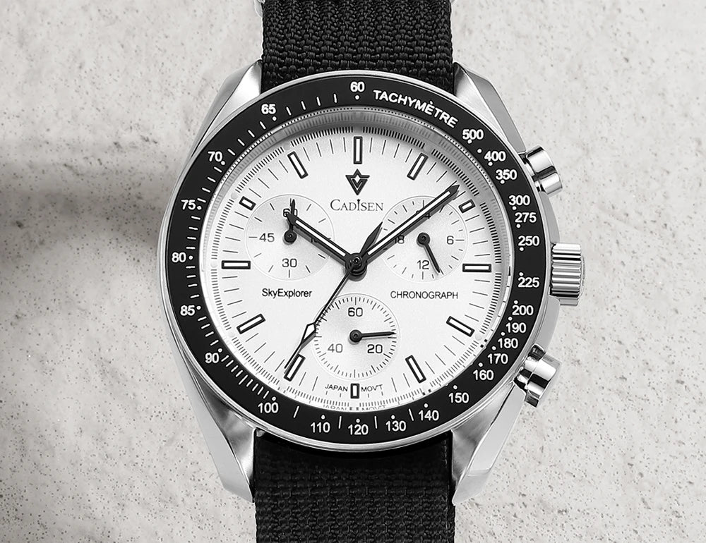 Seu design refinado traz uma caixa em aço inoxidável 316L, pulseira confortável em canvas premium, visor com proteção AR e movimento TMI VK68, um dos cronógrafos japoneses mais confiáveis do mercado.