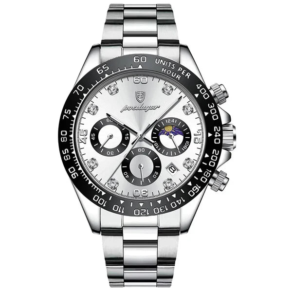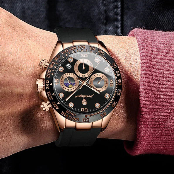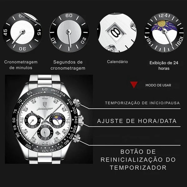 ✦ Funcionalidades modernas: Cronógrafo, calendário automático, resistência à água e ponteiros luminosos.